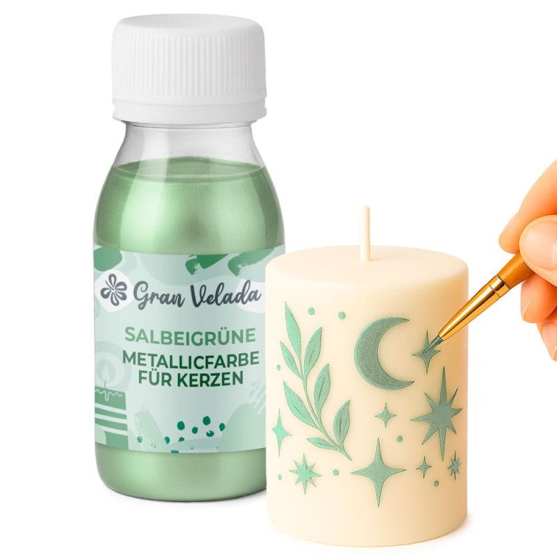 Die Kerzenfarbe, die Sie in unserem Online-Shop kaufen können, ist speziell für das Bemalen von Wachsoberflächen konzipiert. Sie wird in flüssiger Form geliefert und ist in einer breiten Farbpalette mit Metallic-, Perlglanz-, Neutral- und Neontönen erhältlich. Vor allem das metallische Salbeigrün zeichnet sich durch sein weiches, elegantes und natürliches Finish aus und ist ideal für die Dekoration von Kerzen in einem harmonischen und modernen Stil.