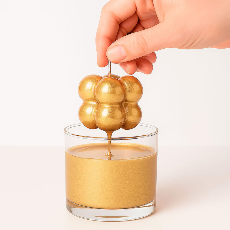 Goldener Lack für Kerzen, mit dem Sie Ihren Kerzen eine schöne Farbe und einen Metallic-Effekt verleihen. Sie erhalten leicht goldene Kerzen, die sich perfekt zum Dekorieren oder für Rituale eignen. Dieser Lack lässt sich leicht auftragen und schnell trocknen und mit ihm können Sie das Aussehen Ihrer Kerzen schnell und einfach verändern. Wir empfehlen Ihnen, den Lack mit der Tauchtechnik aufzutragen, wie unten beschrieben. Bei der Verwendung des Lacks für Kerzen ist es ratsam, dass die Basiskerze helle Farben hat und die Oberfläche gut gereinigt ist. Wenn sie dunkel sind, müssen mehrere Tauchbäder hergestellt werden, damit das Finish perfekt ist. Es ist ein Qualitätslack , der die Verbrennung der Kerze nicht beeinträchtigt. Darüber hinaus erzeugt es bei der Verbrennung keinen Geruch. Vor Gebrauch umrühren, wie ausführlicher erläutert.