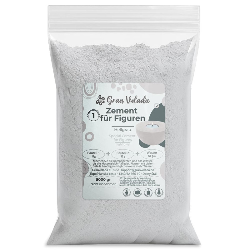 Zement für hellgraue Figuren, mit einer speziellen Formulierung für Handwerk und Dekoration. Hellgrauer Zement, exklusiv für Gran Velada, ist dünner und heller als herkömmlicher Zement. Es ist ideal für die Herstellung von Figuren, da es aus zwei Komponenten besteht, die miteinander vermischt werden müssen und die den Werken ein glattes Finish ohne Unvollkommenheiten verleihen. Sie können Grauzement über unsere Website kiloweise und zu einem sehr günstigen Preis kaufen und mit hellgrauem Zement sehr originell und einzigartig basteln. Um die Figuren herzustellen, müssen Sie ungefähr 1 kg Komponente 1 + 15 g Komponente 2 + 270 g Wasser mischen.