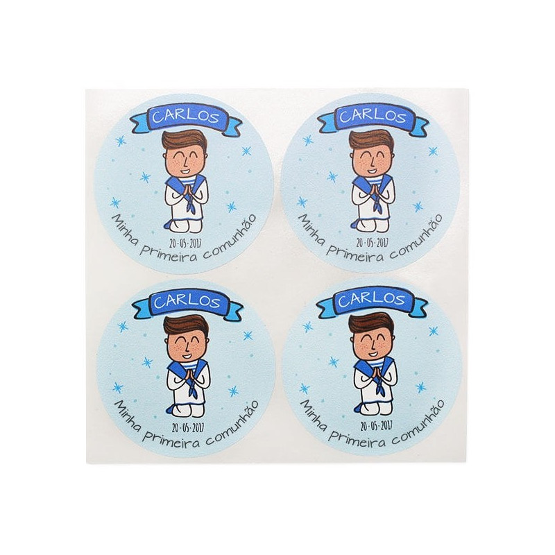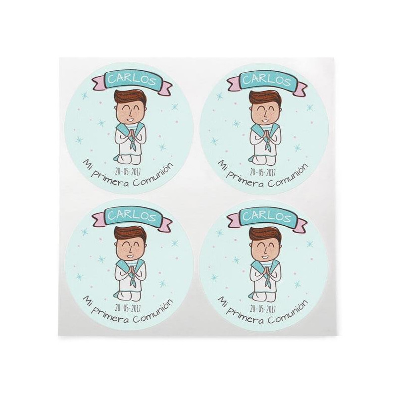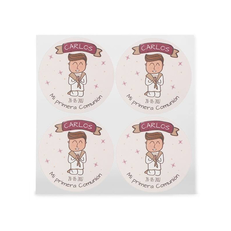 Wenn du auf der Suche nach schönen und originellen Kommunionsaufklebern bist, könnte dieses exklusive Design von Gran Velada zu dir passen. Es handelt sich um moderne Aufkleber, auf denen ein betendes Kind abgebildet ist. Der Vorteil: Sie sind personalisiert.