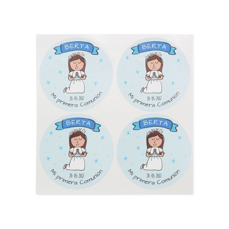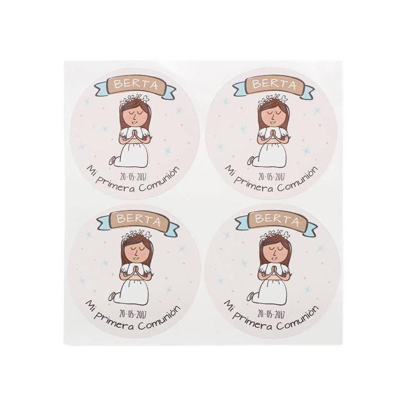 Wenn du auf der Suche nach schönen und originellen Kommunionsaufklebern bist, könnte dieses exklusive Design von Gran Velada zu dir passen. Es handelt sich um moderne Aufkleber, auf denen ein betendes Kind abgebildet ist. Der Vorteil: Sie sind personalisiert.
