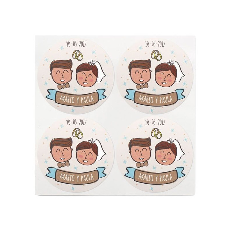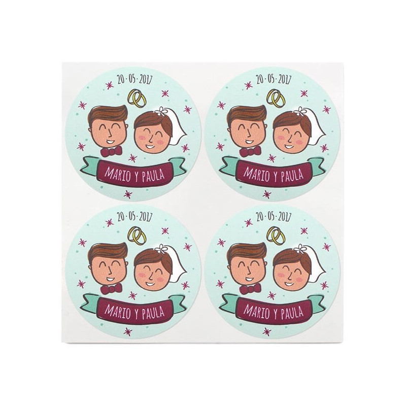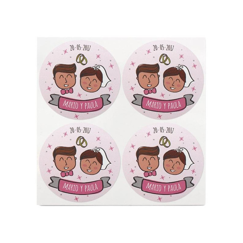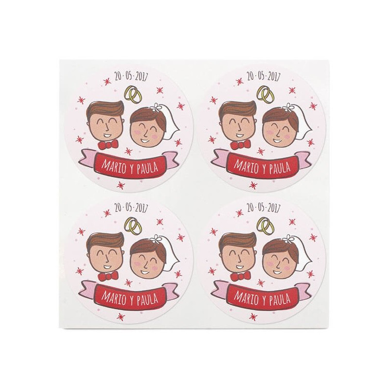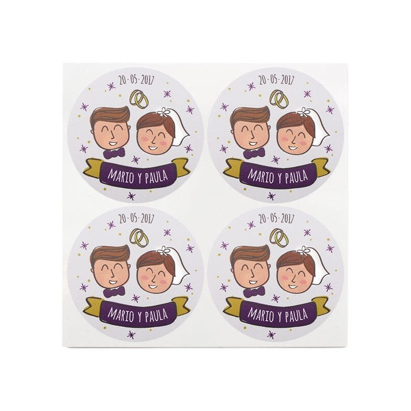 Das Beste daran ist, dass diese Hochzeitsaufkleber mit den Namen des Brautpaares und dem Datum der Hochzeit personalisiert werden können. Wir können auch die Haarfarbe der Braut und des Bräutigams ändern. Auf diese Weise erhältst du einzigartige Aufkleber, die deinen Gastgeschenken eine schicke Note verleihen.