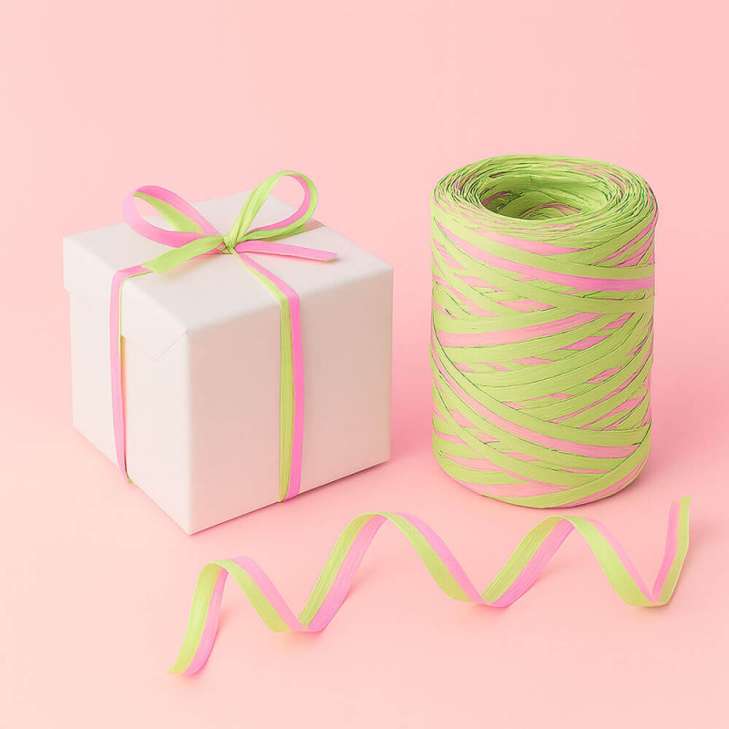 Zweifarbiges Bastband aus rosa Pistazien, um Ihre Geschenke, Gästedetails, handgefertigte Ausarbeitungen, Floristen und alles, was Sie sich vorstellen können, zu dekorieren und zu personalisieren. Das Bastband in zwei Farben, Pistazie und Rosa, ist ideal für die Herstellung von Schleifen und zum Dekorieren von Verpackungen von Hochzeitsdetails und Gästen sowie für alle Arten von Verpackungen, die eine rustikale Atmosphäre verleihen, aber sehr fröhlich und farbenfroh sind. Von Gran Velada stellen wir Ihnen zweifarbige rosa-pistazienfarbene Bastbänder in Rollen unterschiedlicher Größe zur Verfügung: 10, 200 oder 400 Meter. Sie müssen nur die Länge auswählen, die Ihren Bedürfnissen am besten entspricht, und Ihren Kauf bearbeiten. Mit dem pistazienrosa Bastband verleihen Sie jedem Geschenk einen Hauch von Qualität, Professionalität und vor allem Originalität .