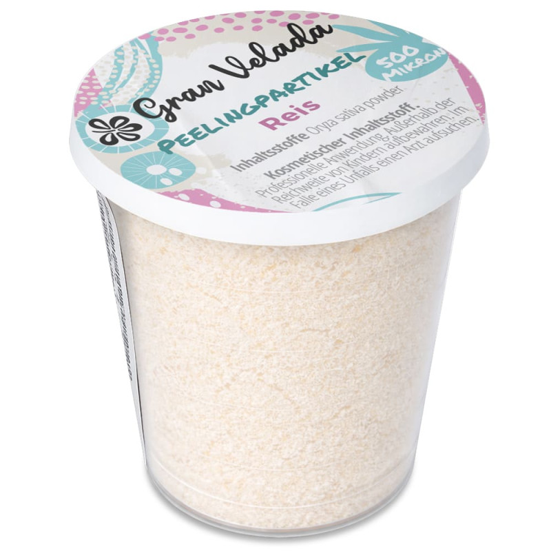 500-Mikron-Reis-Peelingpartikel zur Herstellung von selbstgemachten Peelings. Reis-Peelingpartikel reinigen tief, helfen, überschüssiges Fett zu entfernen und spenden gleichzeitig Feuchtigkeit. Diese Peelingpartikel werden als Zutat in deinen Kosmetikrezepten genutzt. Du kannst sie mit den kosmetischen Basen von Gran Velada, Pflanzenölen, Pflanzenextrakten usw. kombinieren. Du kannst sie auch in deine Seifenrezepte einbauen, sie als Bestandteil deiner selbstgemachten Kosmetika verwenden und ihre Vorteile für deine Haut genießen!