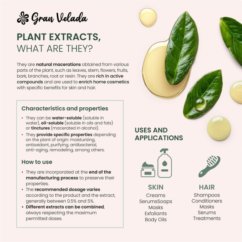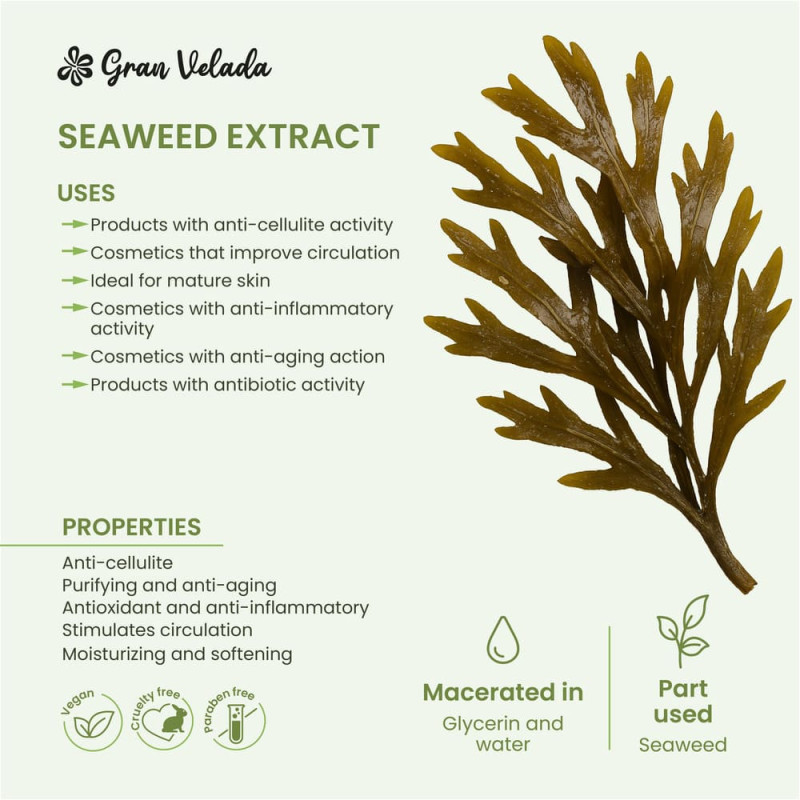 Algenextrakt zeichnet sich durch seine Anti-Cellulite-Wirkung aus. Darüber hinaus müssen wir seine feuchtigkeitsspendende, beruhigende, antioxidative, reinigende und antiseptische Wirkung hinzufügen. Es ist sehr vielseitig und mit ihm können Sie eine große Auswahl an hausgemachten Kosmetika herstellen.