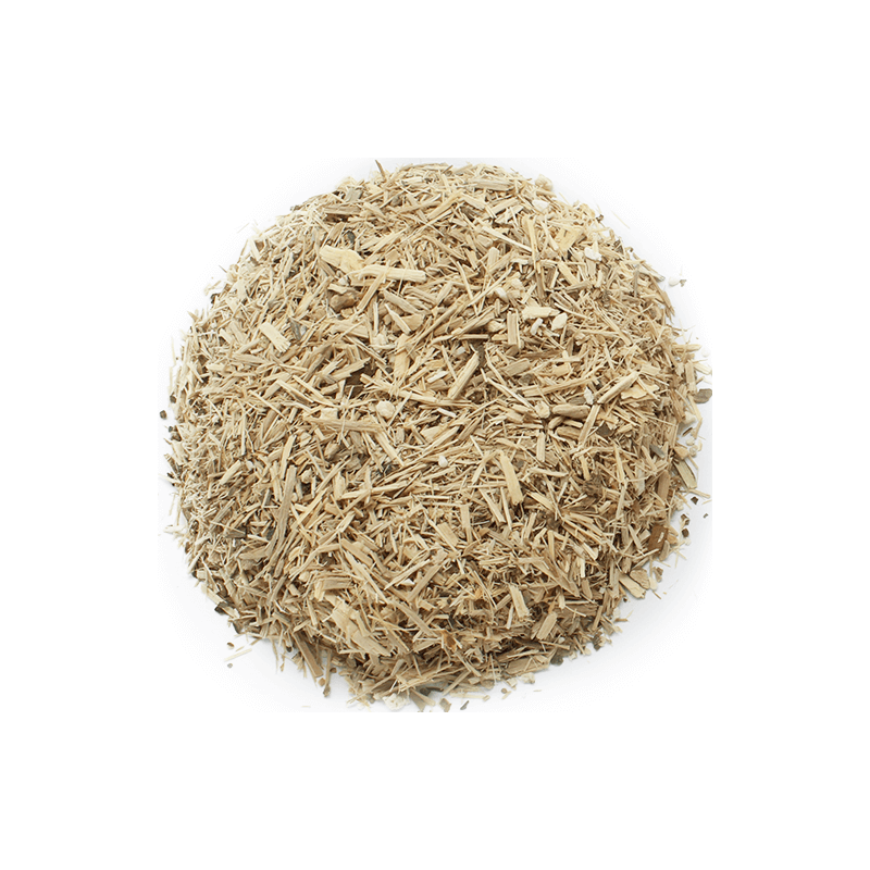 Eleutherococcus-Wurzel, bereits geschnitten und dehydriert, für kosmetische Zwecke. Eleutherococcus ist ein in Sibirien beheimateter Strauch aus der Familie der Araliaceae. Es hat einen unterirdischen Stamm, das Rhizom, in dem die meisten seiner Eigenschaften und Wirkstoffe konzentriert sind.